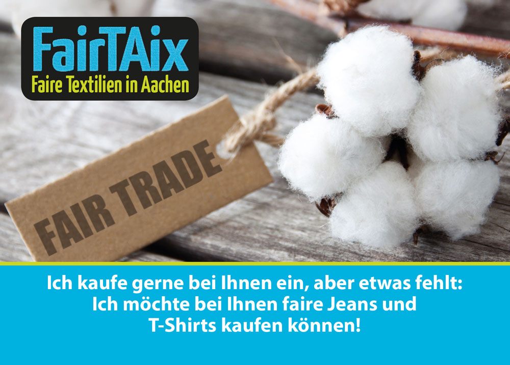 Die Kampagne „FairTAix“ knüpft an diese Bemühungen an und will durch eine Reihe von Aktionen und Veranstaltungen in Aachen das Interesse der Bevölkerung an dem Thema öko-faire Mode und Textilien wecken bzw. wachhalten. Einige große Händler sehen aufgrund unüberschaubarer Marktstrukturen mit Subunternehmen und Subsubunternehmen eine Einflussnahme als unmöglich an. Hauseigene Labels sollen zu einem sozialen oder ökologischen Image beitragen, unterstehen jedoch häufig keiner neutralen von außen organisierten Kontrolle. Erfreulich ist, dass es zunehmend seriöse Siegel gibt, die für fair und ökologisch produzierte Textilien vergeben werden. Solche Siegel bekannter zu machen und auch kleinere, lokale Händler sowie Hersteller die nachhaltig produzieren, in den Blick zu nehmen, ist ein wichtiges Anliegen, das mit der FairTAix-Kampagne erreicht werden soll.
